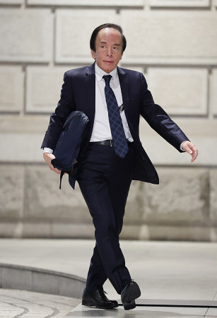 日銀は19日、前日に続き金融政策決定会合を開き、金融政策の現状維持を決めた。政策金利である短期金利の誘導目標は現行の「0.75%程度」に据え置いた。写真は日銀本店に入る植田和男総裁=東京都(代表撮影) 【時事通信社】